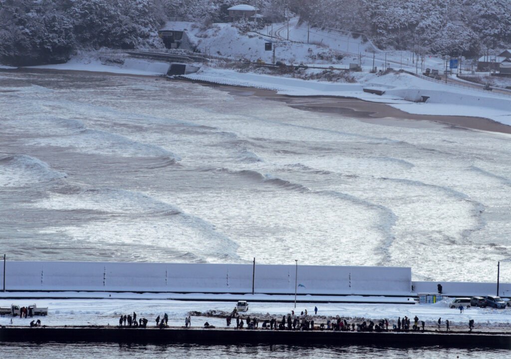 ワカメ祭りが開催中の船磯漁港には、扇を広げたような波が打ち寄せる。