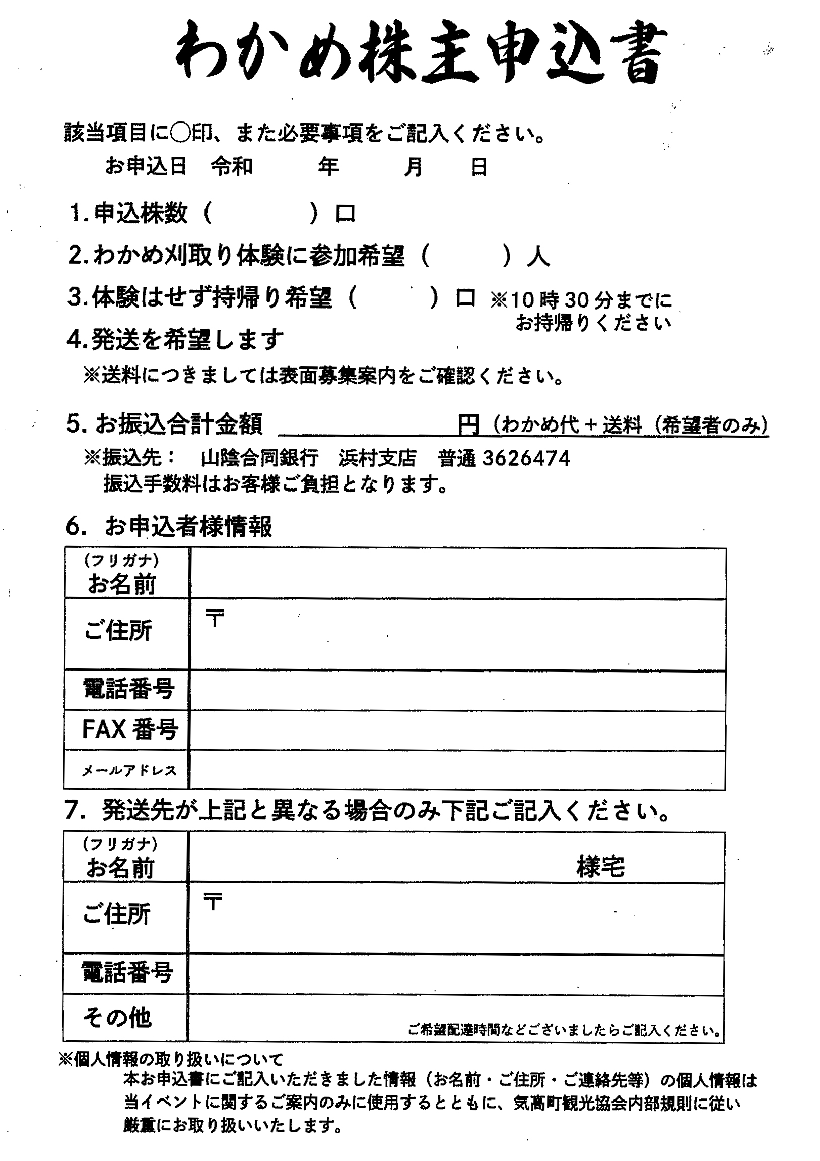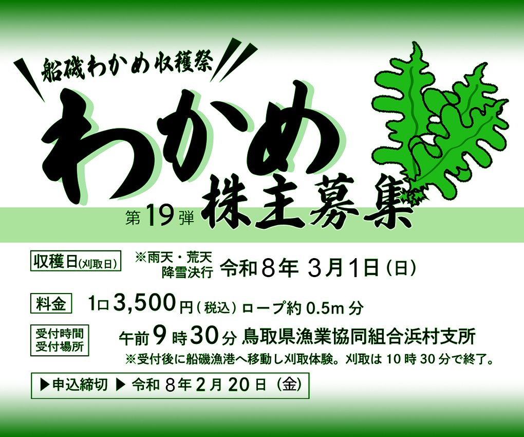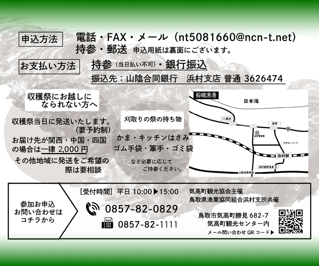 [受付時間]午前9時30分 ※受付後に船磯漁港へ移動し刈取体験。刈り取りは10時30分で終了